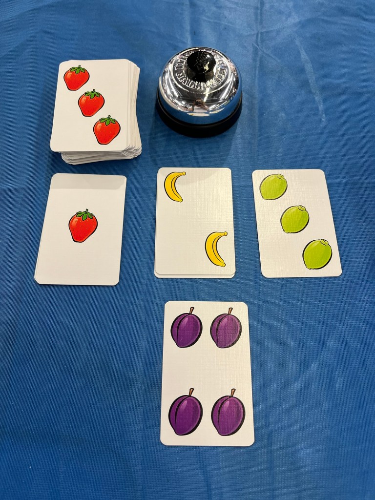 - Quando la carte girate dai giocatori danno come somma 5 frutti uguali i giocatori dovranno suonare il campanello più rapidamente degli altri: il primo che riesce, si aggiudica le carte girate degli altri giocatori e le pone sotto il suo mazzetto.