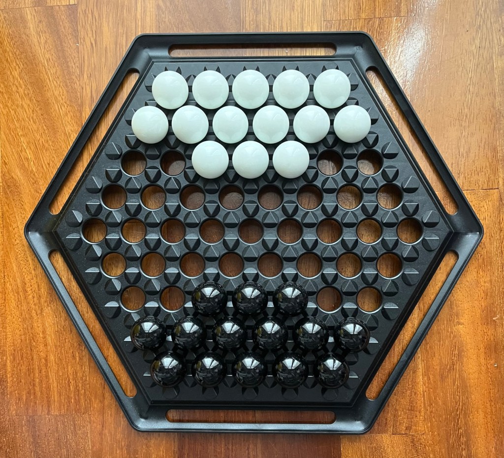 Abalone è un gioco dinamico e avvincente in cui i giocatori spingono le biglie avversarie fuori da una scacchiera esagonale con cavità.