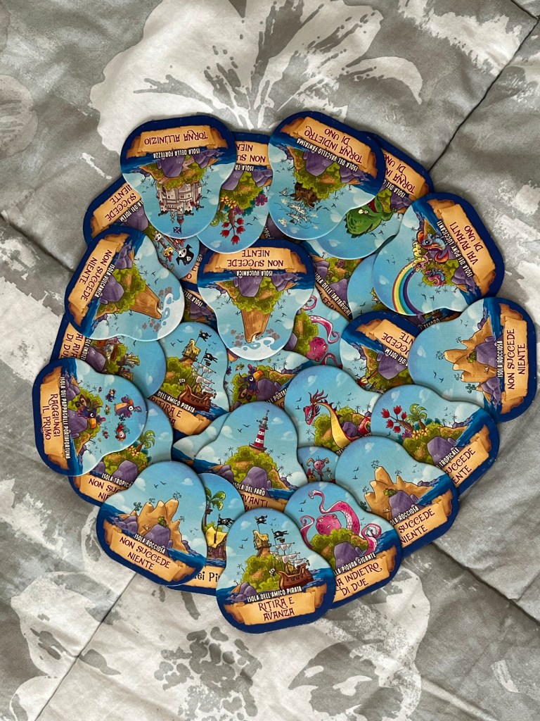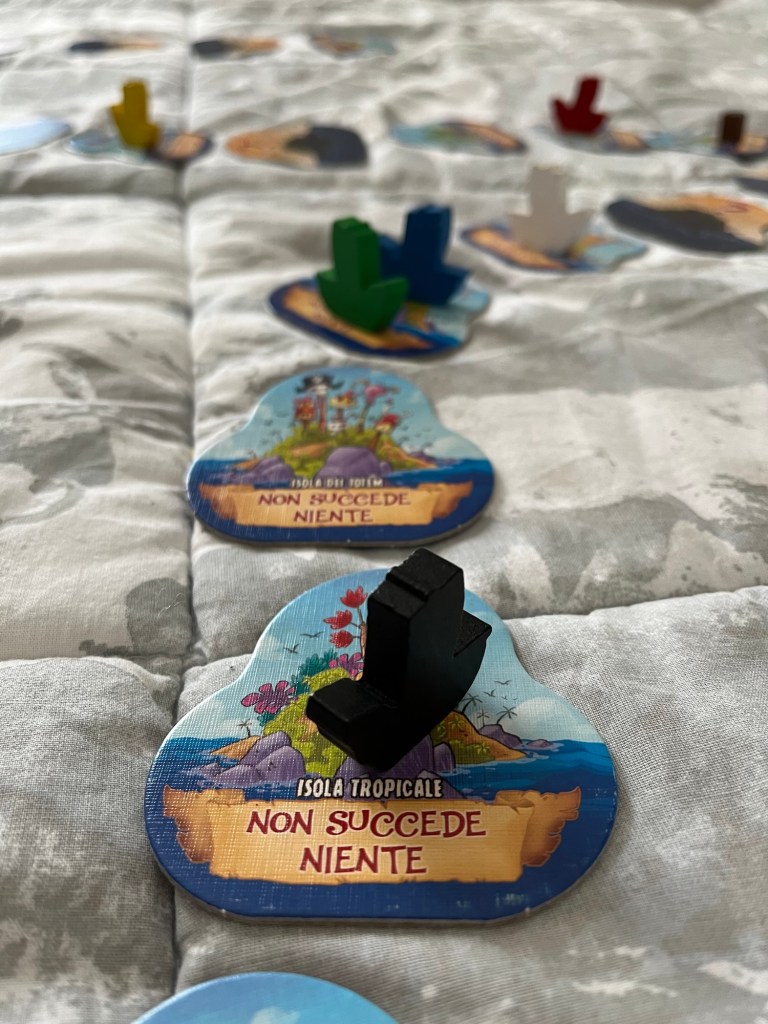 Le tessere Isola, mescolate e posizionate a faccia in giù, creano un tracciato sempre diverso, con la tessera del tesoro come traguardo.
