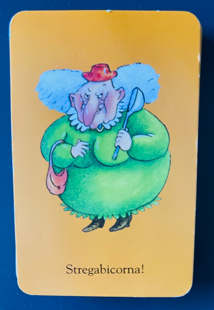 La zuppaccia di Cornabicorna di Babalibri è una versione del noto gioco di carte Asino, arricchito di una ruota azioni e basato sulla storia della strega Cornabicorna.